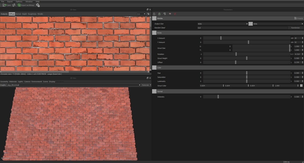Brick wall substance texture with few options for customization including brick rotation, amount of bricks, grout size, color. It is a fully procedural texture, with best detail at 4k resolution.