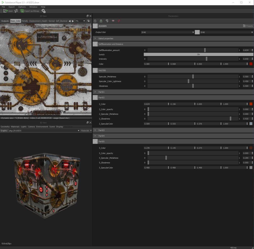 All substances come with adjustments for baked lighting, AO, shadows, master control for glossiness/roughness, metallic, specular properties and also 5 (with few exceptions where there is only 4) additional shader adjustments for color, color opacity, glossiness/roughness, specular/metallic channels for various parts of the texture.